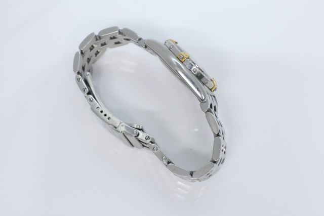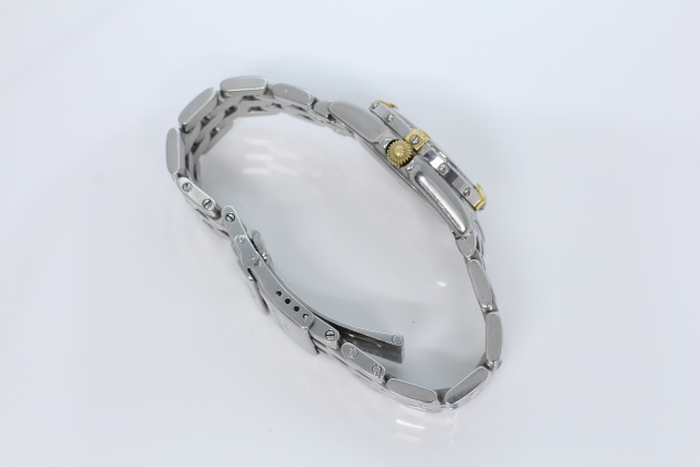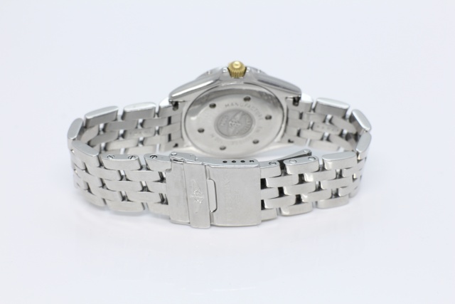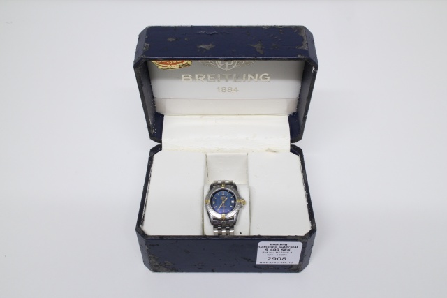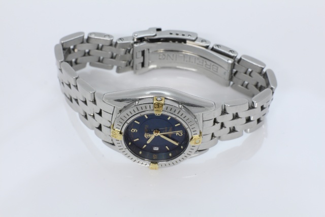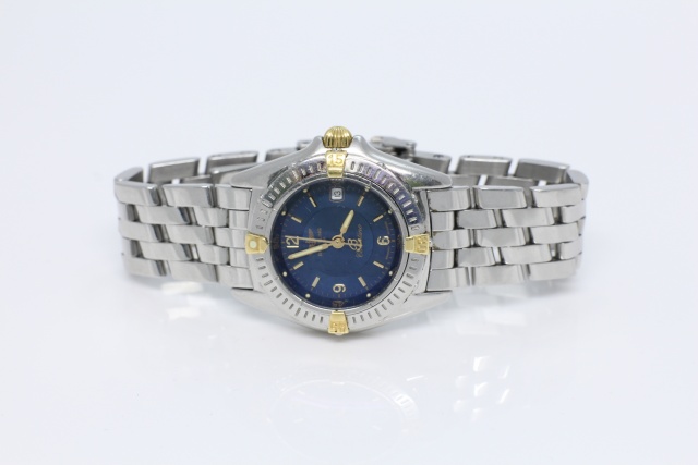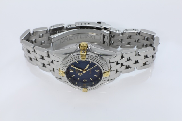 En stilig och "petit" damklocka i stål med detaljer i 18 karat guld. Gott skick med ytliga spår av användning som lätt går att polera till riktigt fint skick. Snygg blå urtavla med siffror och index i guld, och självlysande visare i guld. Uret sitter på pilotlänk i stål.
