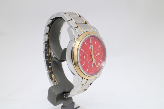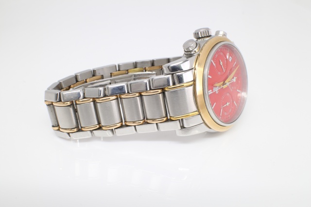 Ferrari-entusiaster se hit. En schweizisk lyxklocka tillägnad Ferrari, tillverkad av prestigefyllda Girard-Perregaux. En sportklocka med röd urtavla, boett i polerat stål med glasring i borstat roséguld, länk i polerat/borstat stål med detaljer i roséguld, och dolt dubbelt viklås. Klockan är ursprungligen köpt 1997 på Nymans Ur och levereras komplett med originalboxar och certifikat. Skicket är mycket gott med enstaka små märken på boetten och ett fåtal ytliga swirls på länken.