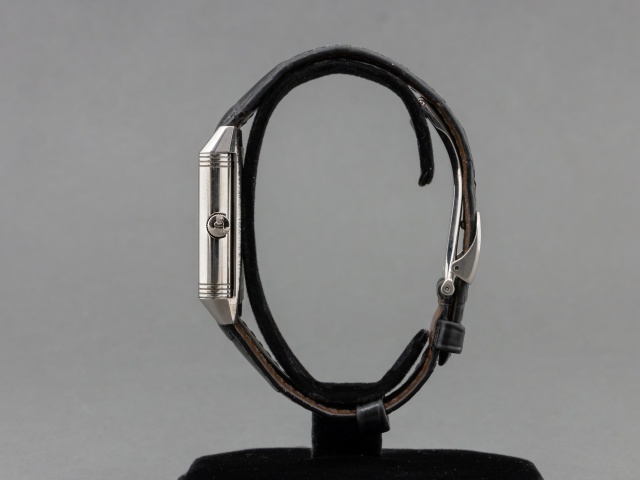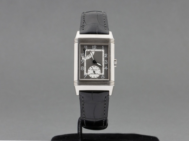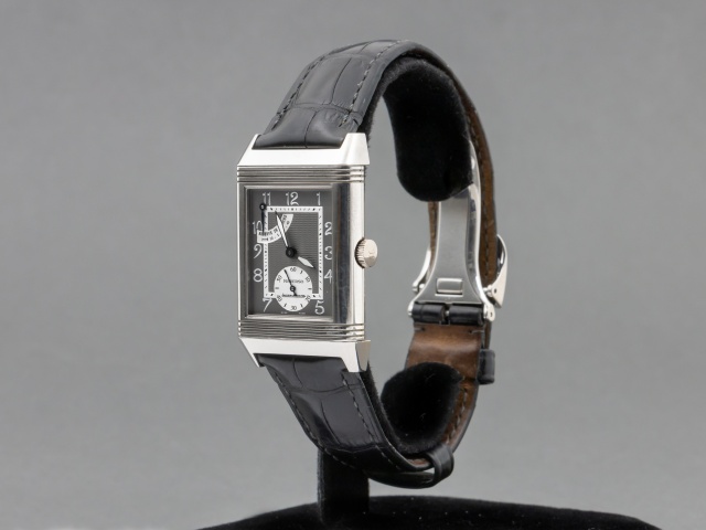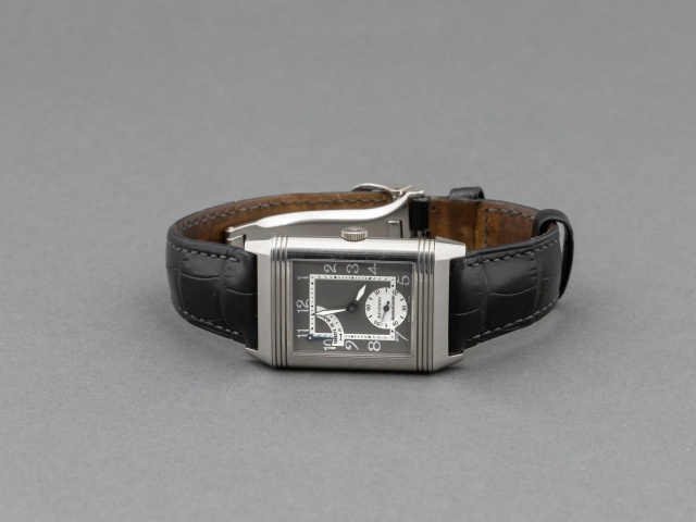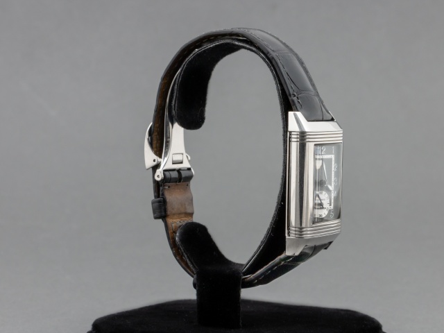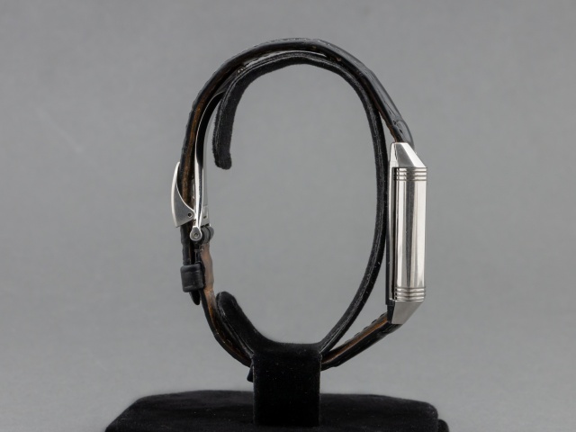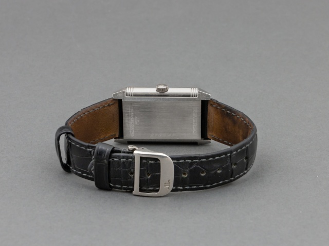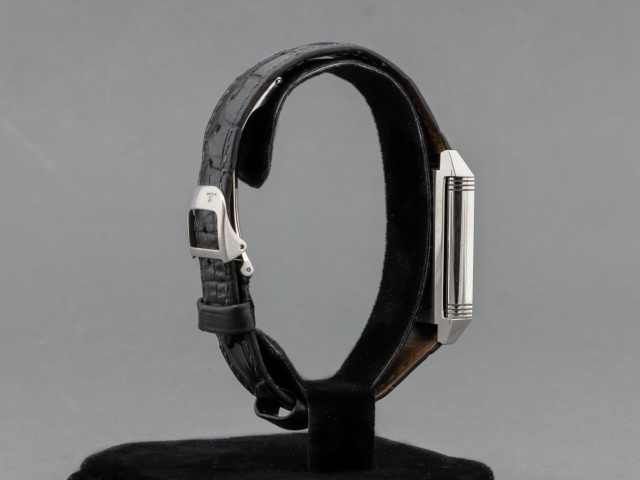 En fantastisk herrklocka för den kräsne gentlemannen! Det första som möter ögat är en fantastik grå urtavla med vågmönster i centrum och arabiska siffror i kursiv stil. Självlysande visare, sekundvisare i subdial vid kl 6 och gångreservindikator i övre vänstra hörnet - "Reserve de Marche". Reverso innebär att uret går att vända, från början tänk för att skydda klockan vid utövande av hästpolo.