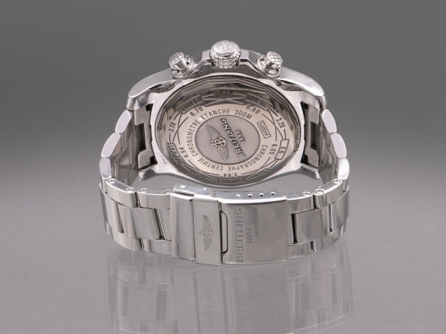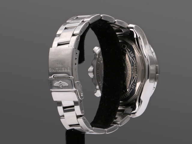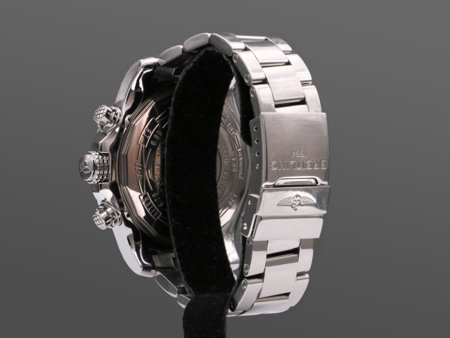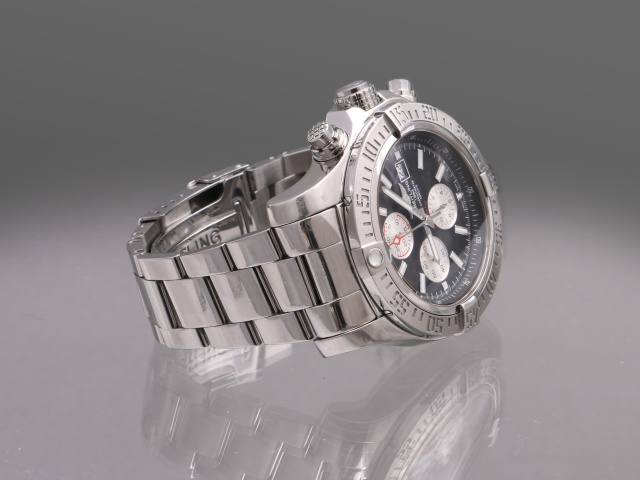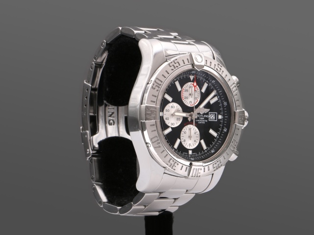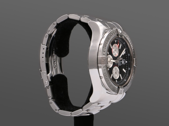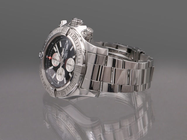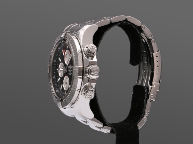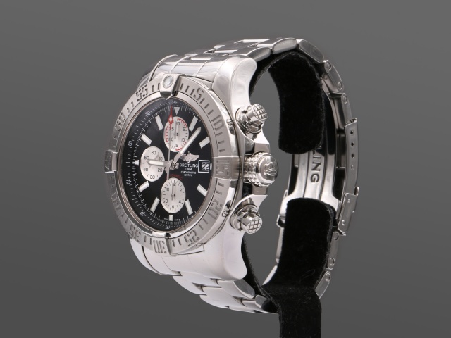 Breitlings maffigaste dykarur Super Avenger Kronograf, hela 48 mm i diameter. Den kraftiga boetten och länken är i blankpolerat stål. Den har svart urtavla med polerade självlysande index och visare, och svarta subdials.