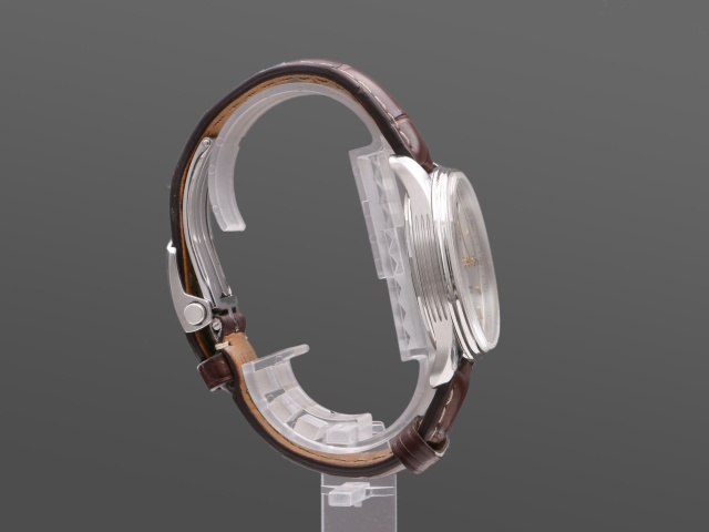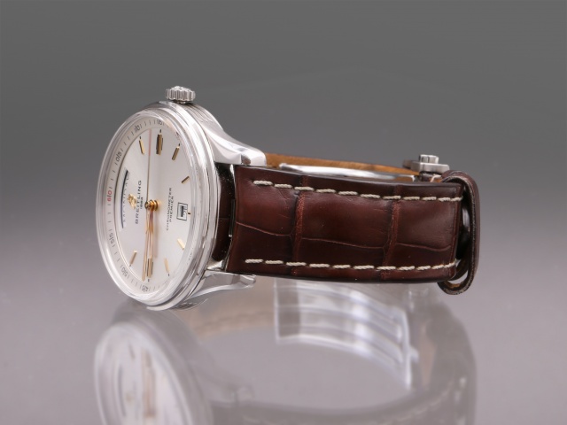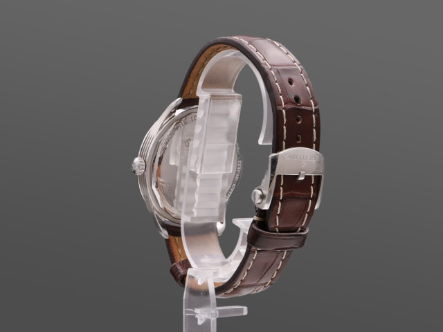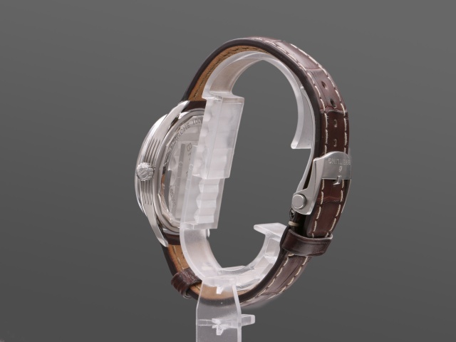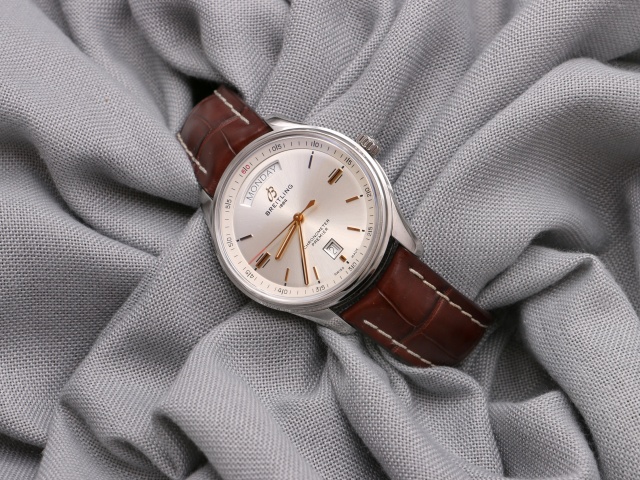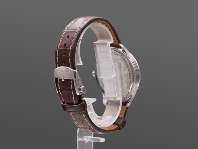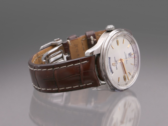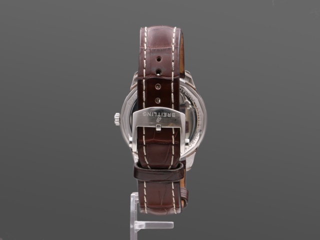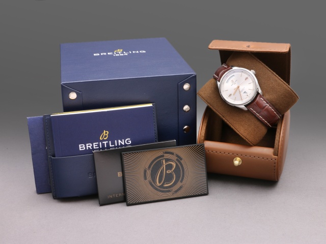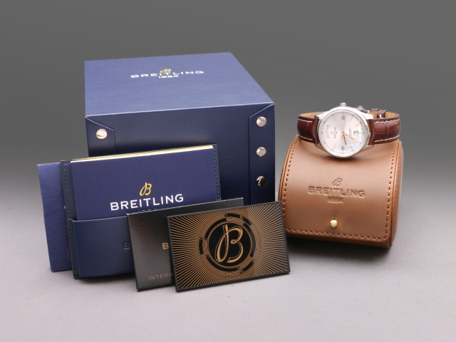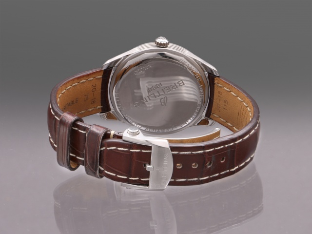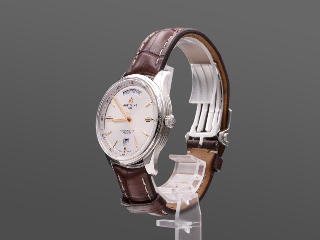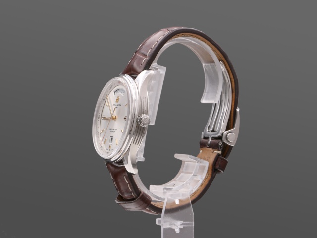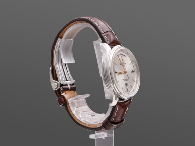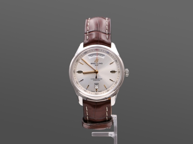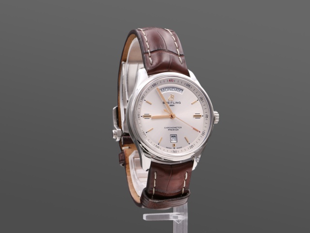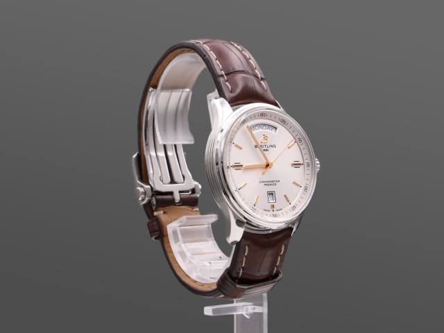 Breitling's stiliga Premier med anor från 1940-talat. Boetten är 40 mm i polerat och borstat stål, med räfflor i sidan av boetten. Silverfärgad "sunray" eller "Sunbrushed" urtavla med polerade index och visare i rött guld(?). Uret kommer på original läderband i mörkbrunt krokodilskinn med vita sömmar, med viklås.