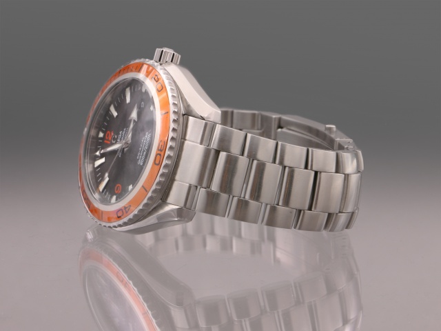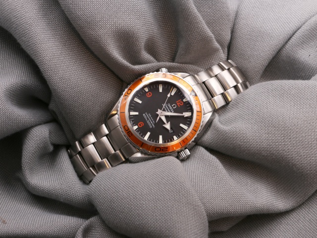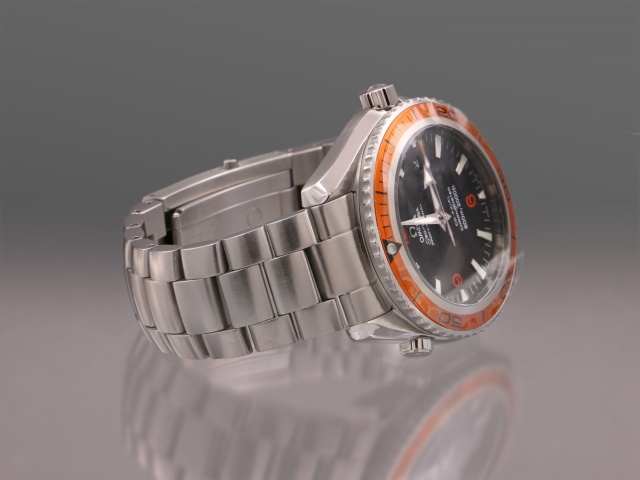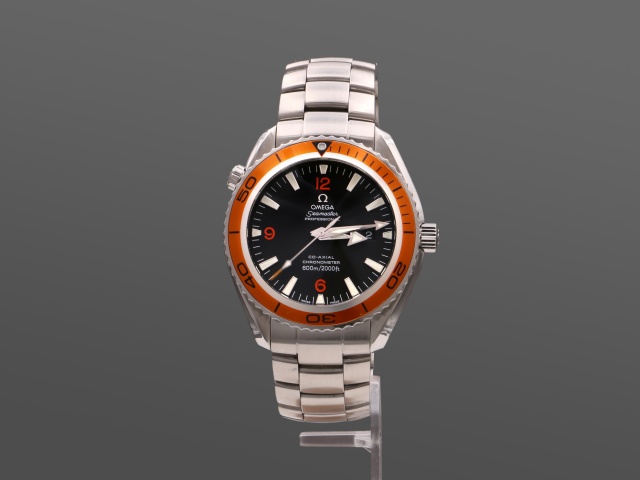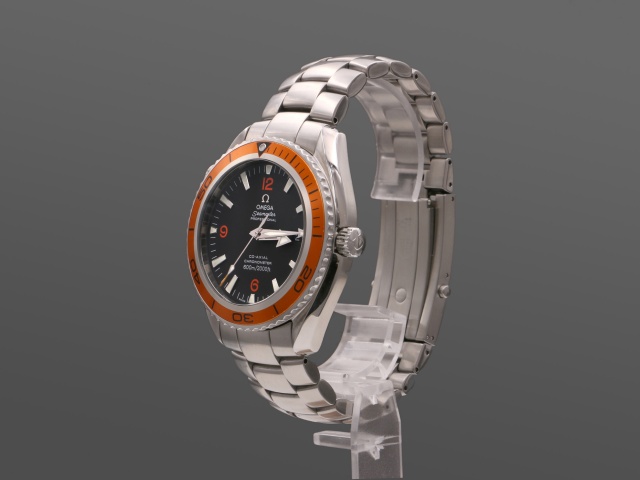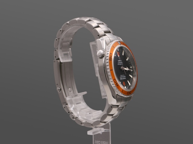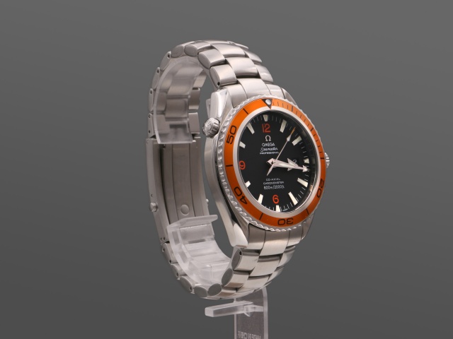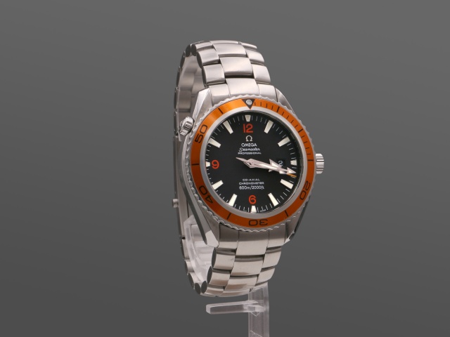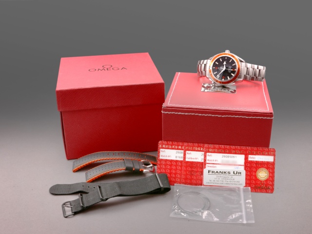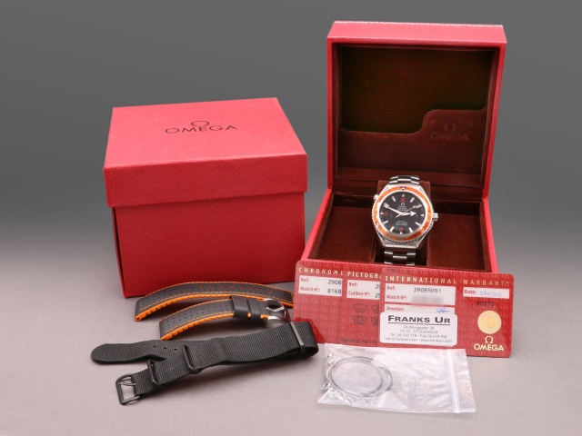 En modern klassiker från Omega, 45,5 mm PO med den karakteristiska orangea ringen. Den har svart urtavla med röda siffror och självlysande index, självlysande "Arrow" visare. Klockan kommer på stållänk, och det finns ett Hirsh Robby med svart kalvskinn på orange gummi (+500 kr) samt ett svart Natoband (+200 kr) att köpa till. Båda i nyskick, ev oanvända.