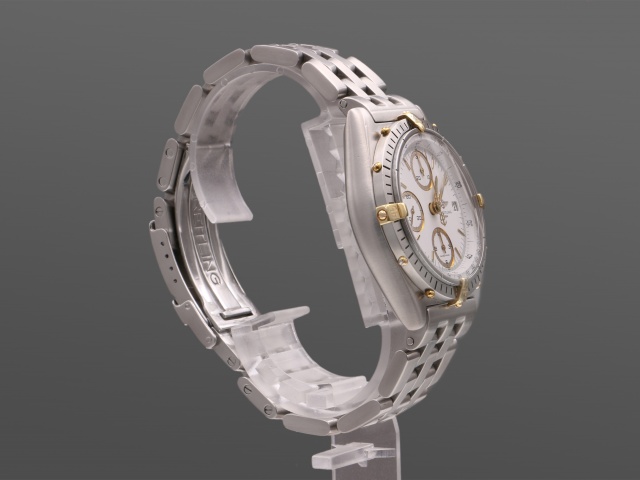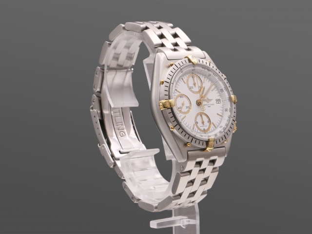Breitlings klassiska 90-tals Chronomat på pilotlänk. 39mm boett i borstat stål, med guldpläterad krona och knappar. Vit/guld urtavla med självlysande markeringar och visare i trevligt vintage-skick med viss patina. Borstad bezel i stål med guldriders och guldskruvar.