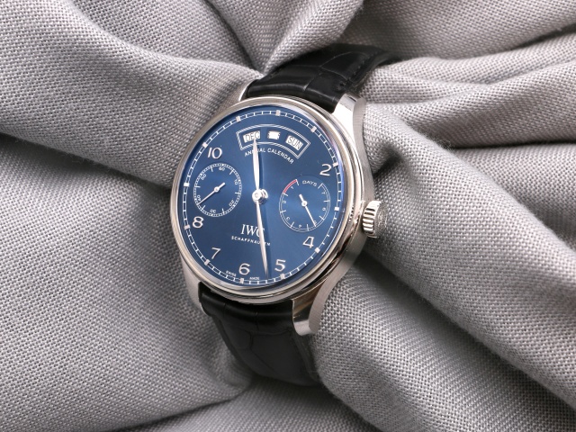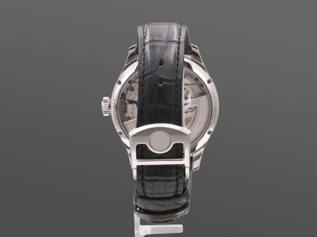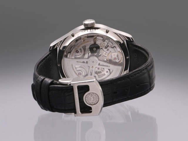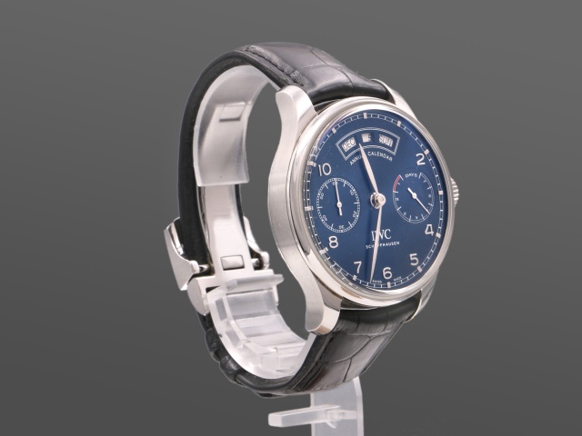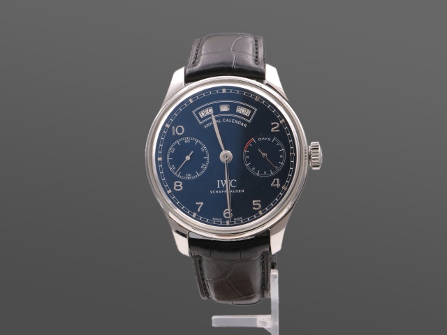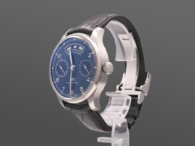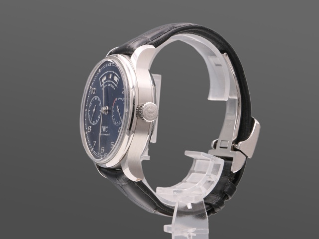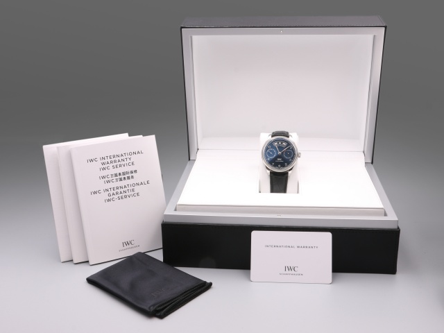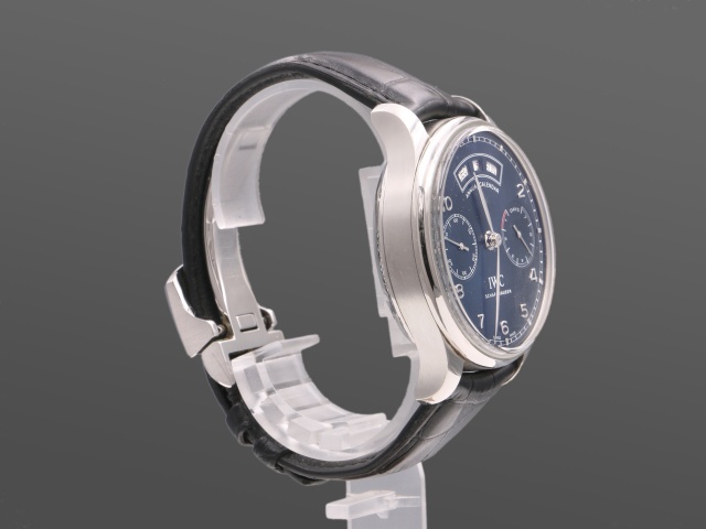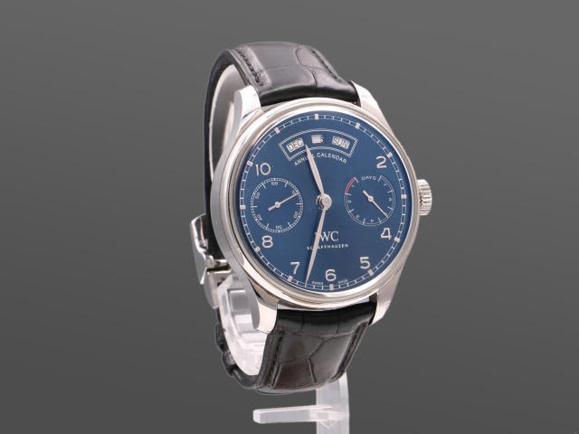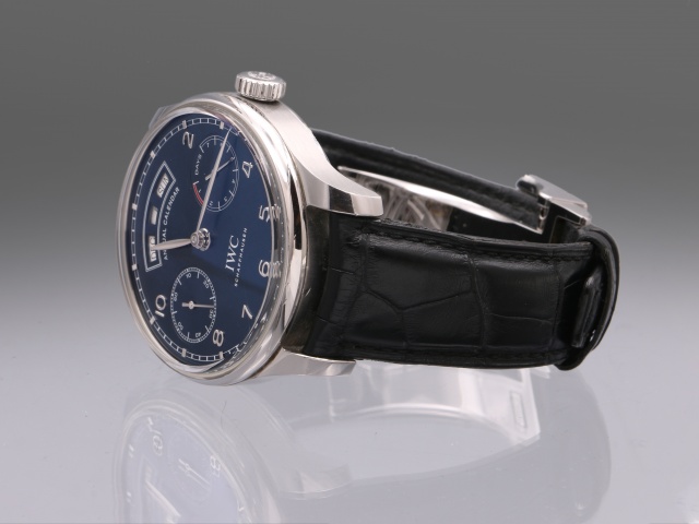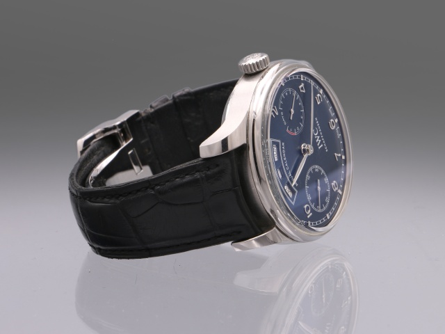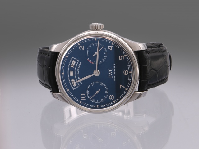 En sportig dressklocka från IWC; Portuguese i stål med skimrande blå "Synray" urtavla och svart croco-band med viklås.