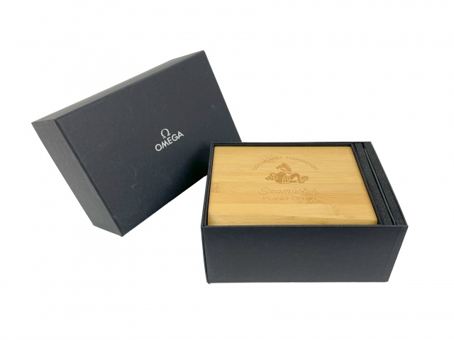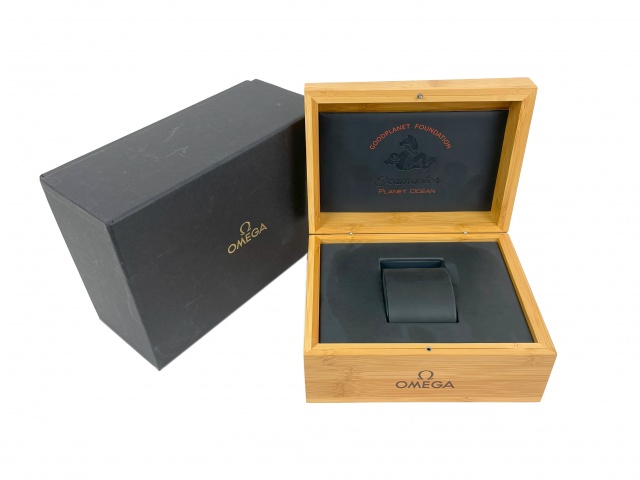 Omega originalbox till herrklocka Seamaster Planet Ocean Goodplanet Foundation. Komplett svart ytterbox, innebox i trä och kortficka. Ingen manual/bok. Helt ny men med små märken på pappboxen från förvaring i butik.