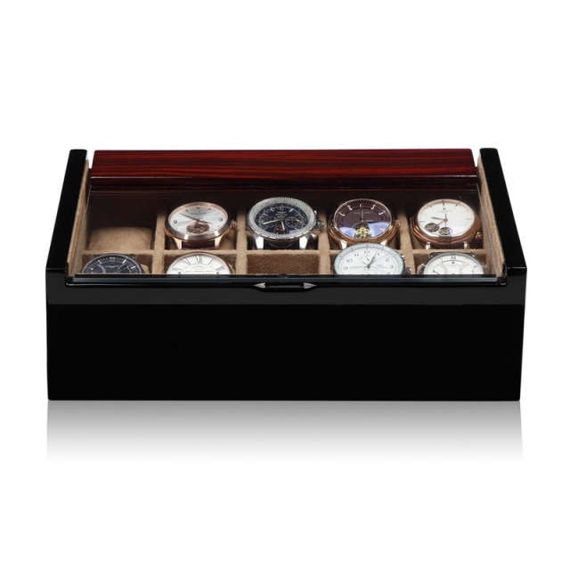 De handgjorda LUCIA klockboxarna av massivt trä och lock med stor härdad glasskiva erbjuder en utmärkt förvaring och snygg display av din klocksamling. De tre olika färgalternativen svart, ebenholts och carbon gör att de passar i de flesta miljöer.